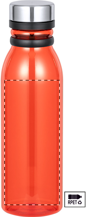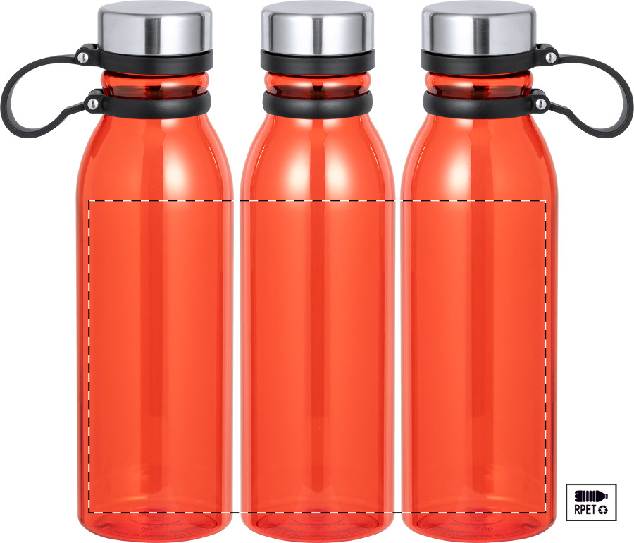 Trinkflasche aus RPET (BPA-frei) mit Tragedeckel aus Edelststahl. Füllmenge: 830 ml. Nicht geeignet für kohlensäurehaltige Getränke.